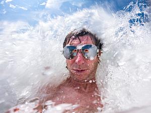 Man in lake wearing sunglasses with wave splashing Port Colborne , Ontario